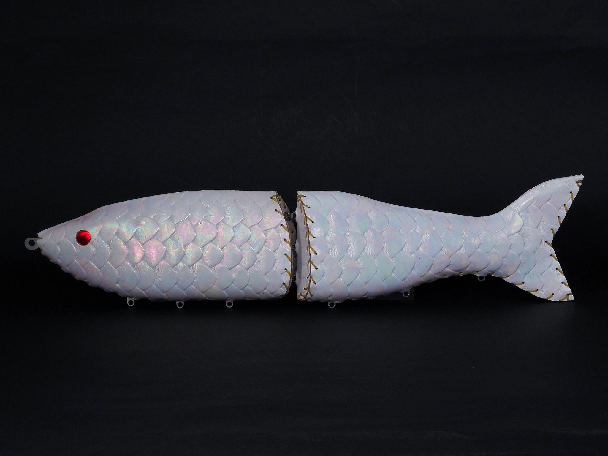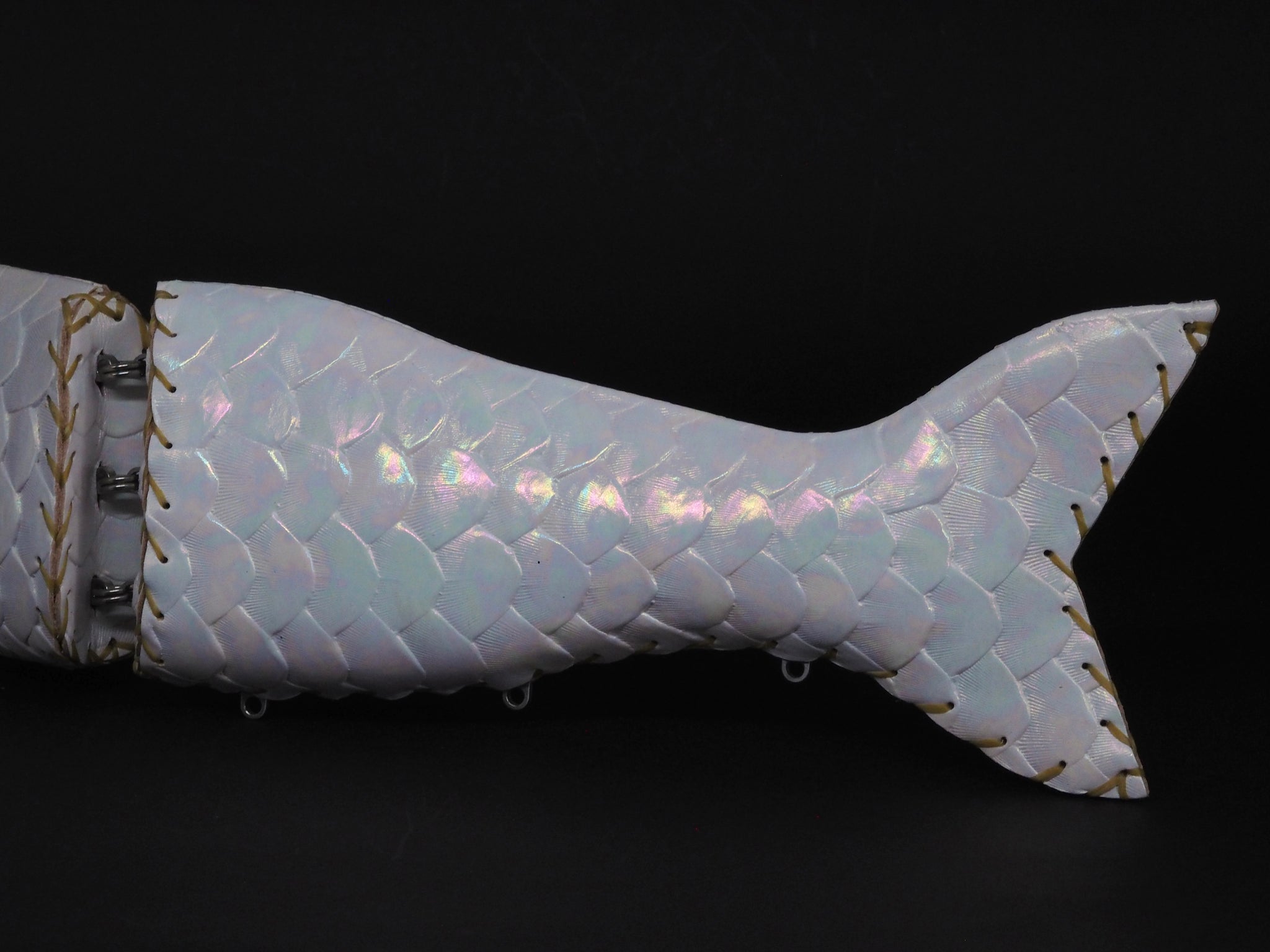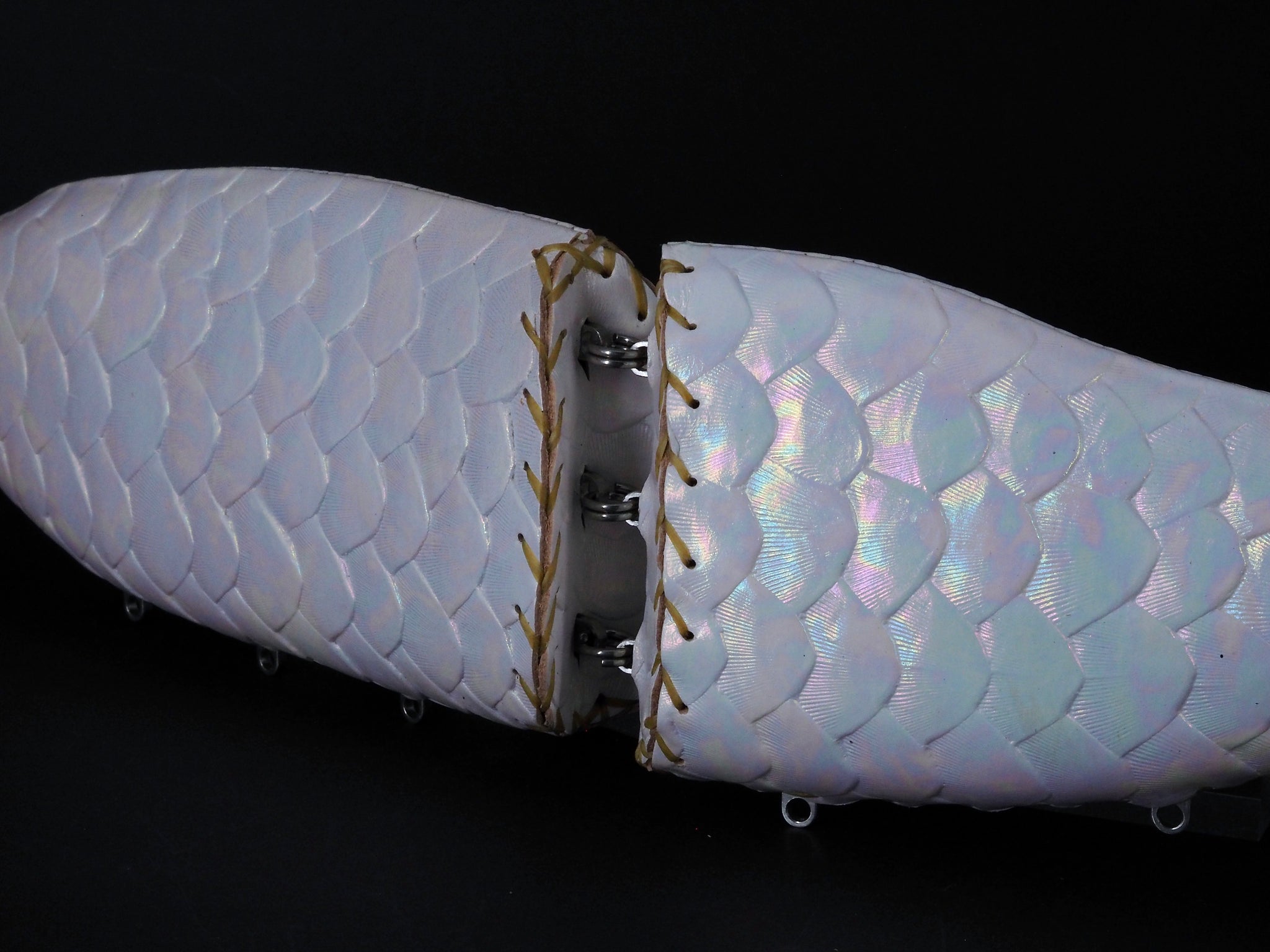 ホワイト顔料を施した牛ヌメ皮革に鱗型押し後ホログラム箔を貼ったカラー