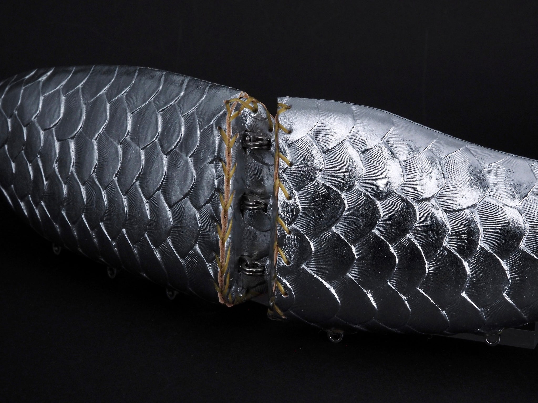 牛ヌメ皮革に鱗型押し後シルバー箔を貼ったカラー