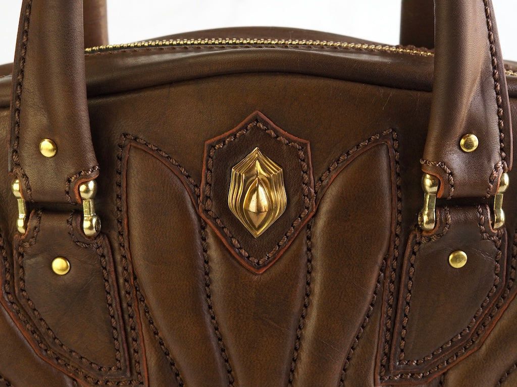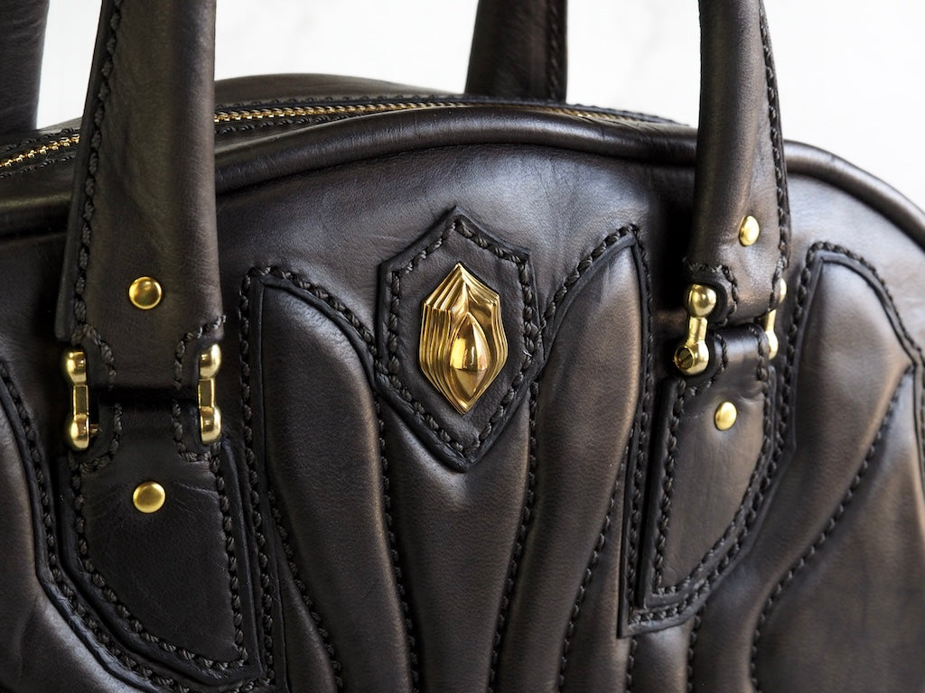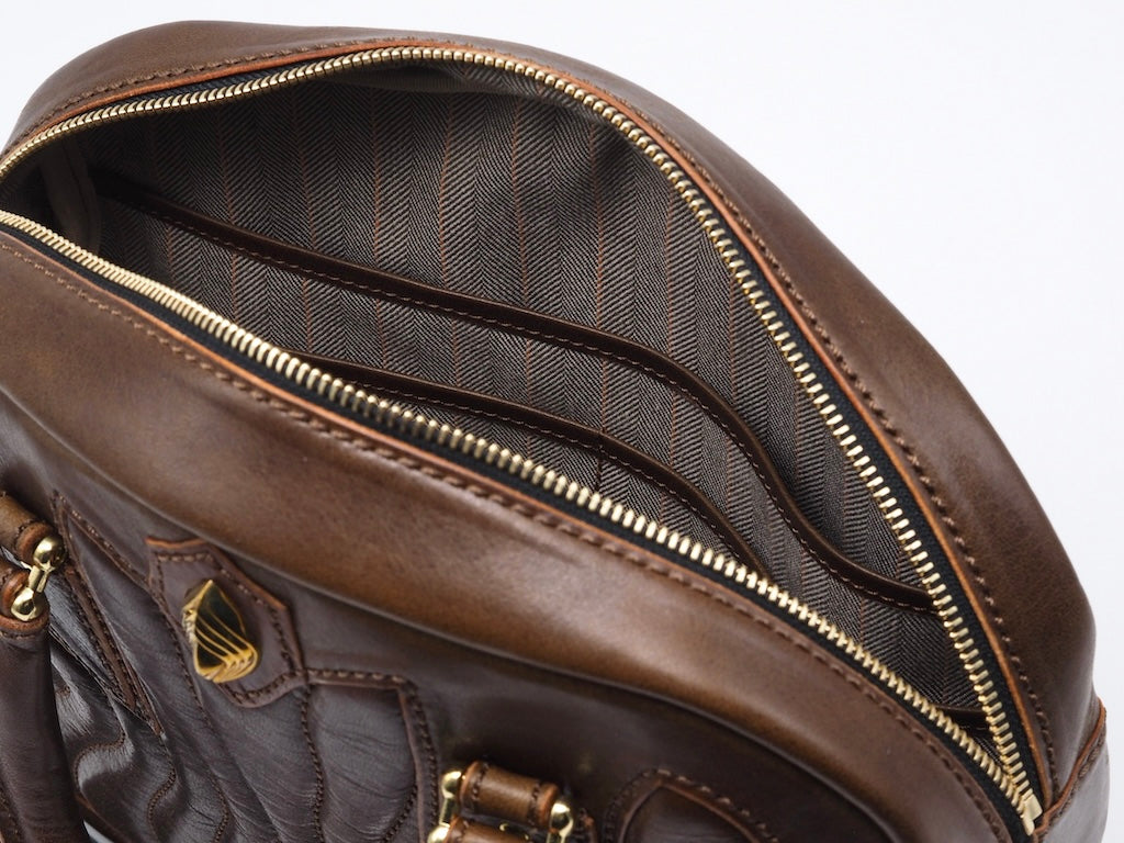 パフアップ仕立てによる窓枠内の馬ヌメ皮革と本体の馬ヌメ皮革は同じ